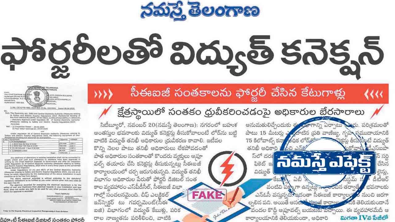 విద్యుత్శాఖలో ప్రధాన విద్యుత్ తనిఖీ అధికారి, డిప్యూటీ అధికారుల ఫోర్జరీ సంతకాలతో కనెక్షన్లు తీసుకున్న వైనంపై నమస్తే తెలంగాణలో వచ్చిన కథనం సంచలనం రేపుతుంది. చీఫ్ ఎలక్ట్రికల్ ఇన్స్పెక్టర్ టు గవర్న�