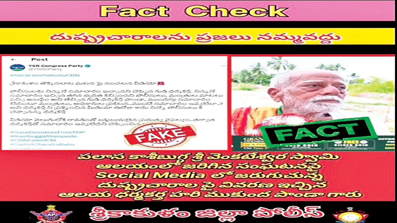 Fake video on social media ఓ ప్రైవేట్ ఆలయంలో జరిగిన తొక్కిసలాట ఘటనను వైసీపీ సోషల్ మీడియా వేదికగా శవ రాజకీయం చేసేందుకు యత్నించింది. ఓ ఫేక్ వీడియోను పోస్టు చేసి పోలీసులు, ప్రభుత్వంపై తప్పు నెట్టేయాలని చూసింది. దీన్ని పోలీసులు ఖండిస్తూ ఫ్యాక్ట్చెక్తో అసలు వీడియోను పెట్టారు.