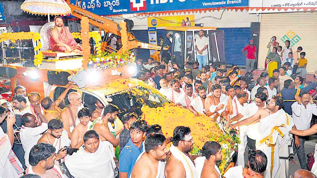 సుప్రసిద్ధ పుణ్యక్షేత్రమైన వేములవాడ శ్రీపార్వతీ రాజరాజేశ్వరస్వామివారిని శృంగేరి పీఠాధిపతి జగద్గురు శ్రీవిధుశేఖరభారతి మహాస్వామి ఆదివారం రాత్రి దర్శించుకున్నారు. ఆలయంలో వారికి అర్చకులు పూర్ణకుంభ స్�