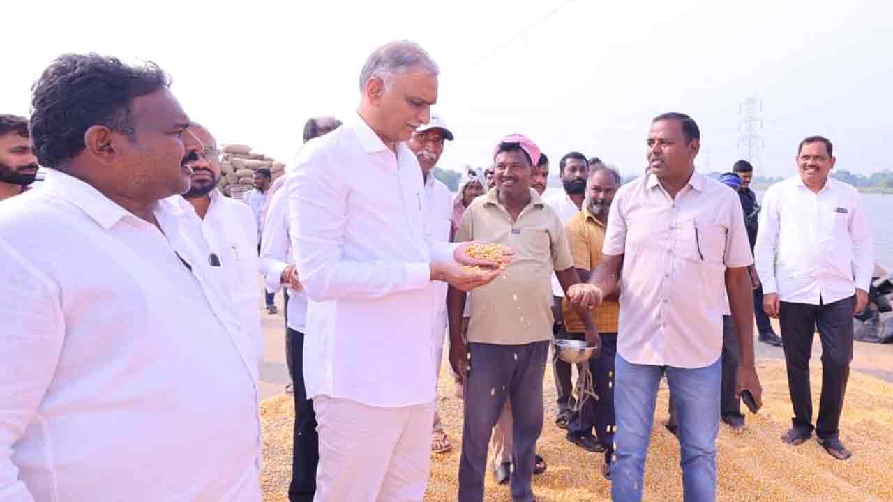Harish Rao సిద్దిపేట జిల్లా చిన్నకోడూరు మండలం గంగాపూర్లో రైతులతో మాజీ మంత్రి హరీశ్రావు ముచ్చటించారు. బావి వద్ద మధ్యాహ్నం భోజనం చేస్తున్న మొక్కజొన్న రైతులను హరీశ్రావు ఆత్మీయంగా పలకరించారు. వారి సమస్యలను అ